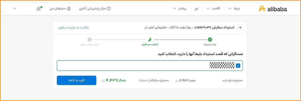 حالا صفحه جدیدی باز می‌شود که باید در آنجا علت استردادتان را مشخص کنید. اگر پرواز شما توسط هواپیمایی کنسل شده، گزینه «پروازم توسط ایرلاین لغو شده است» را انتخاب کنید. اگر هم خودتان تصمیم به کنسل‌کردن بلیط دارید، گزینه «به دلایل شخصی می خواهم از پرواز انصراف دهم» را بزنید. اگر ساعت پرواز از سمت شرکت هواپیمایی تغییر کرده و شامل استرداد بدون‌جریمه می‌شود، گزینه «پروازم بیش از دوساعت تاخیر یا تعجیل داشته است» را انتخاب کنید و روی «تایید و ادامه» بزنید.