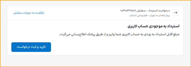 در مرحله بعدی  نحوه دریافت مبلغ استرداد را مشاهده می کنید و روی گزینه‌ «تایید و ثبت درخواست » بزنید. توجه داشته باشید در صورت استرداد بلیت، مبلغ قابل بازگشت تنها به حساب کاربری شما در علی بابا برگشت داده می شود.