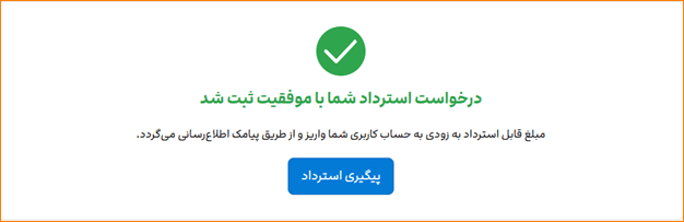 بعد از طیکردن همه این مراحل، پیام «درخواست استرداد شما با موفقیت ثبت شد» به شما نمایش داده میشود.
