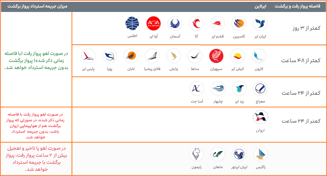 اگر پرواز رفت یا برگشت مسافر از هواپیمایی کیش ایر، کارون، سپهران، ساها، وارش، تابان و فلایپرشیا باشد و فاصله پرواز رفت و برگشت هم کمتر از 48 ساعت باشد، پرواز برگشت بدون جریمه استرداد میشود.
