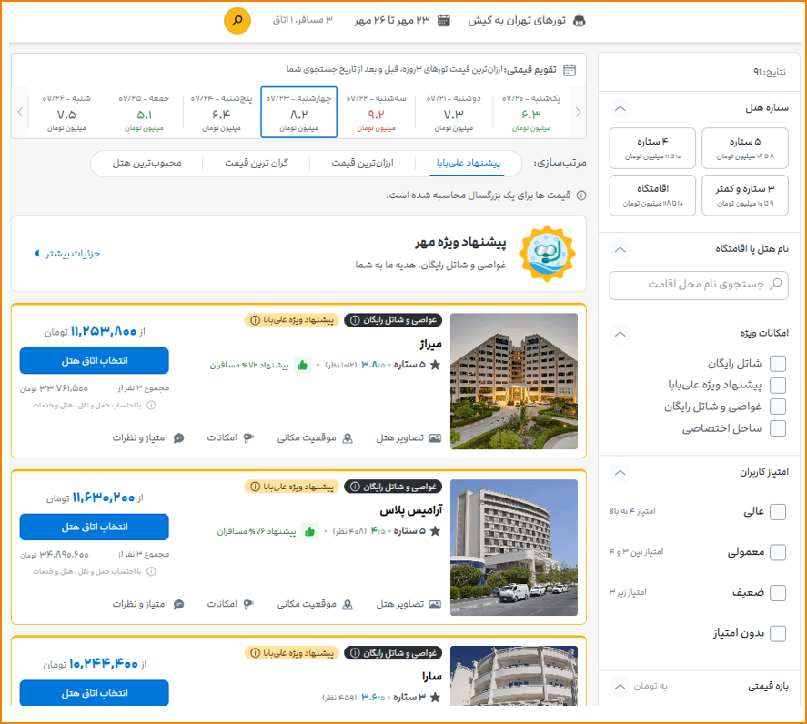 براساس نرخ تور در روزهای مشخصشده توسط کاربر