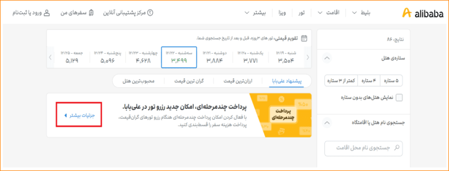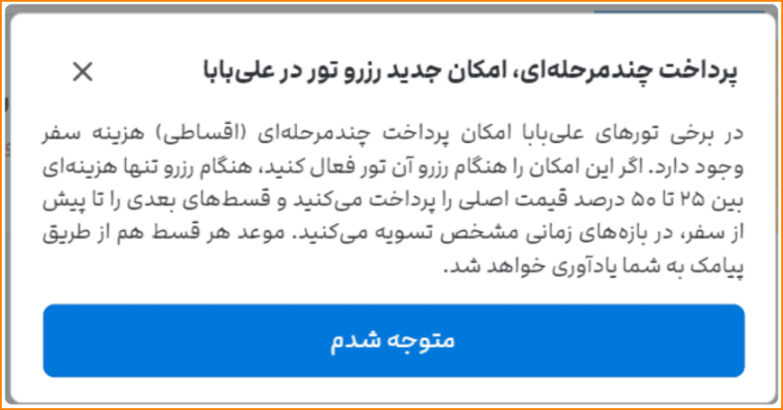 توجه داشته باشید بعضی از تورها که چند روز تا زمان سفر فاصله دارند، امکان پرداخت چندمرحلهای دارند.