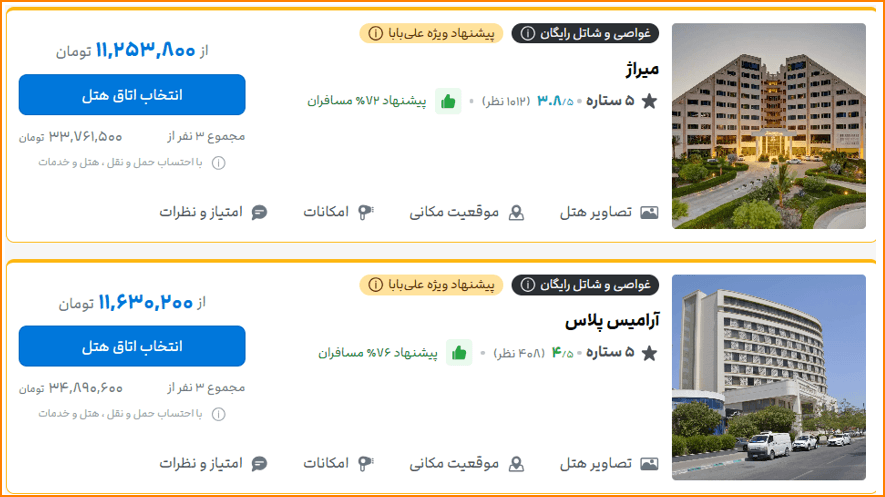 در مرحله اول رزرو تور، باید هتل خود را انتخاب کنید. در این صفحه میتوانید اطلاعات زیر را درباره هر هتل ببینید و سپس هتل موردنظرتان را انتخاب کنید: