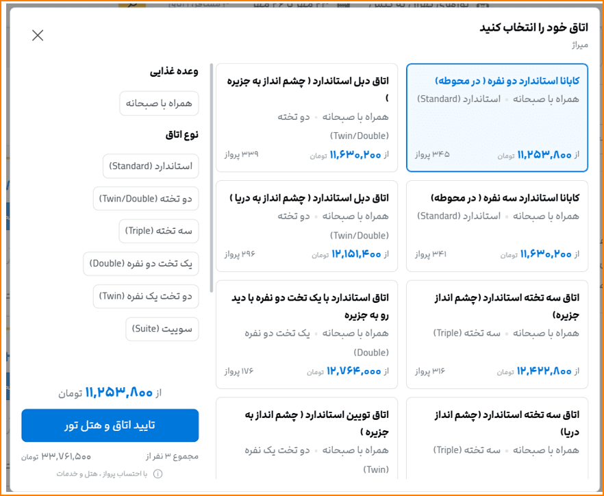 حالا وقت آن است که هر هتل را بیشتر بررسی کنید. با انتخاب گزینه آبیرنگ «انتخاب اتاق هتل» به صفحه بعدی بروید. در این مرحله میتوانید تایپ اتاق مدنظر خود را انتخاب کنید و با انتخاب گزینه «تایید اتاق و هتل» تور را به مرحله بعد ببرید.