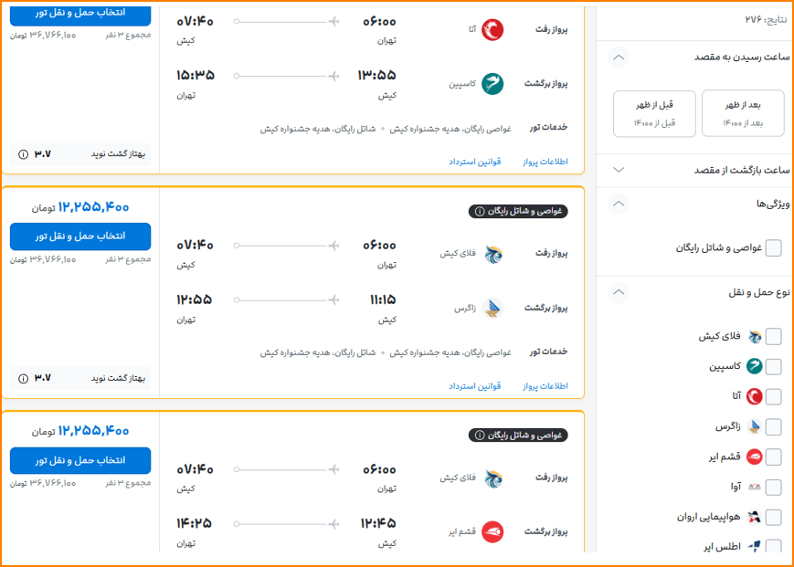 در این مرحله باید ساعت پرواز و نوع ایرلاین را انتخاب کنید. در این قسمت، فیلترهایی وجود دارد که با اعمال آنها، جستوجوی شما سریعتر و راحتتر انجام میشود:
