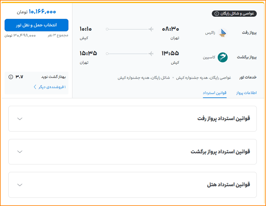 همچنین میتوانید اطلاعات پرواز و قوانین استرداد هر پرواز را مشاهده کنید.