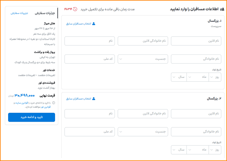 سپس گزینه «تایید و ادامه خرید» را انتخاب کنید تا وارد مرحله بعد شوید.بعد از انتخاب «تایید و ادامه خرید»، یک بار دیگر مشخصات تور و تاریخ رزرو را بههمراه اطلاعات مسافران بررسی کنید و از درستی اطلاعات مطمئن شوید.