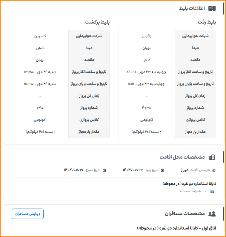 اگر اطلاعات مسافران اشتباه بود یا نیاز به تغییر داشت، روی گزینه «بازگشت» کلیک کنید تا به صفحه قبل برگردید و اطلاعات را اصلاح کنید.