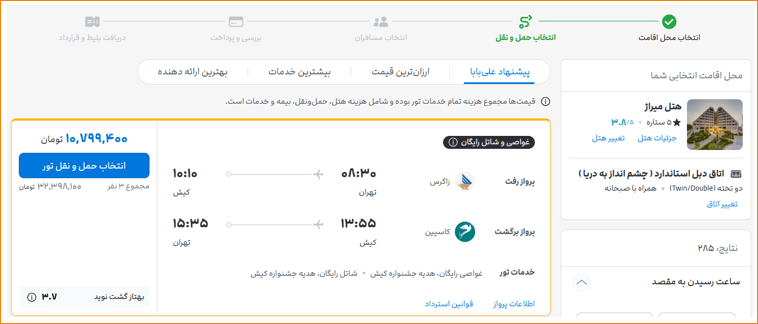 بعد از انتخاب تور موردنظر با تامینکننده و حملونقل دلخواه، مشخصات همه آنها را با دقت وارد کنید. اگر قبلا از وبسایت علیبابا برای همین مسافران خرید یا رزرو انجام دادهاید، مشخصات آنها را میتوانید از بخش «مسافران سابق» بازیابی کنید و نیازی به ثبت دوباره اطلاعات نیست. همچنین میتوانید جزئیات تور انتخابشده را مشاهده کنید.