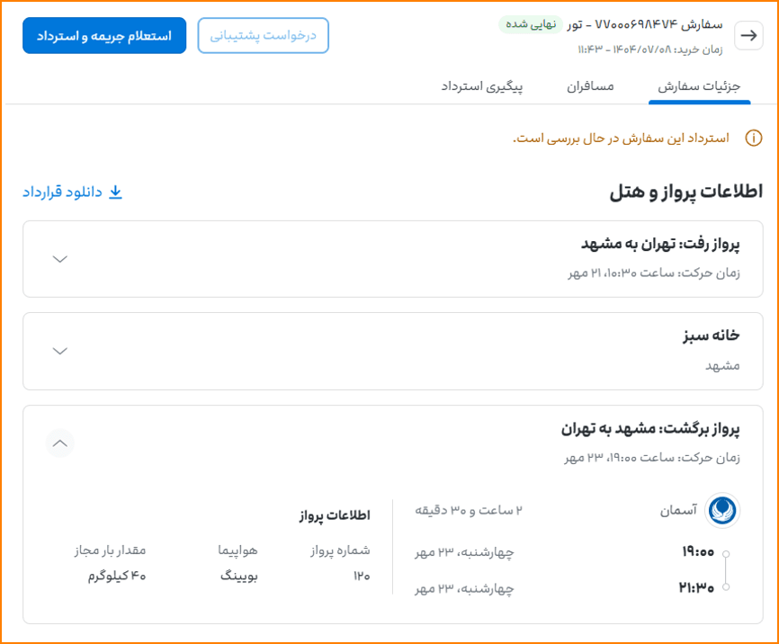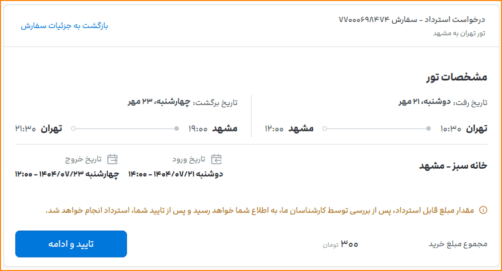در نظر داشته باشید در استرداد تور، مبلغ قابلاسترداد بعد از بررسی توسط کارشناسان پشتیبانی به شما اطلاع داده میشود و پس از تایید شما، استرداد انجام میشود.