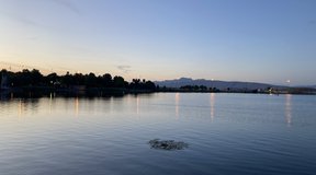 تصور کنید منظرهای پر از گلهای نیلوفر با پسزمینه غروب آفتاب روبهروی...