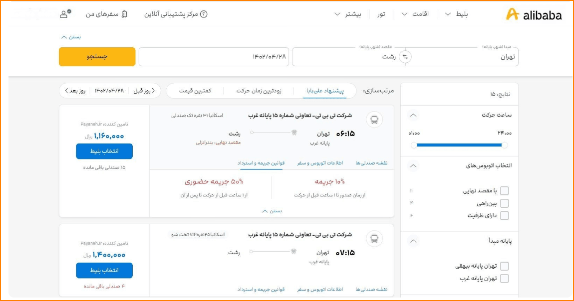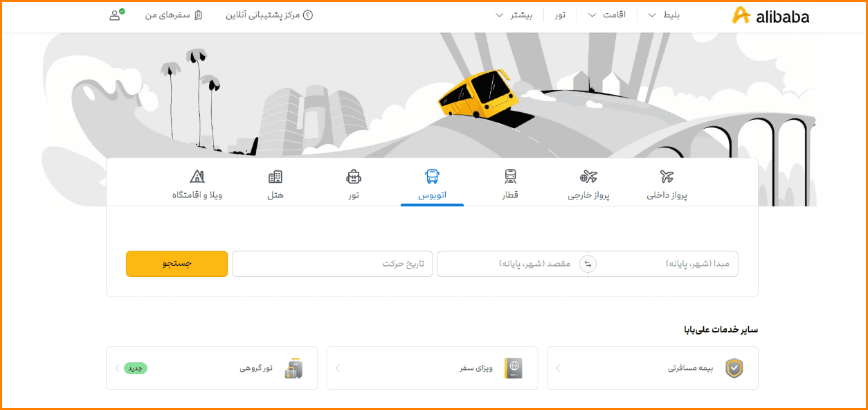 برای خرید بلیط اتوبوس، به صفحه اول وبسایت علیبابا وارد شوید و روی گزینه «اتوبوس» کلیک کنید. سپس باید اطلاعاتی مثل مبدا، مقصد و تاریخ سفر را مشخص کنید و دکمه جستجو را بزنید تا همه بلیطهای اتوبوس مسیر انتخابیتان، برای شما نمایش داده شود. دقت داشته باشید در محصول اتوبوس امکان انتخاب مسیر رفت و برگشت وجود ندارد، برای انجام سفر رفت و برگشت دو خرید مجزا انجام دهید.