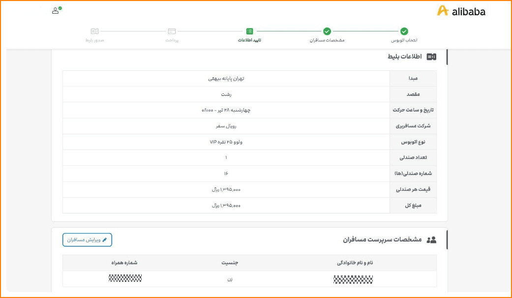 در این صفحه، تمام اطلاعات شما (اطلاعات شخصی و اطلاعات اتوبوسی که بلیطش را گرفتهاید) به شما نمایش داده میشود. حتما بهدقت این بخش را بررسی کنید؛ چون بعد از تایید نهایی خرید بلیط اتوبوس، دیگر امکان تغییر وجود ندارد.